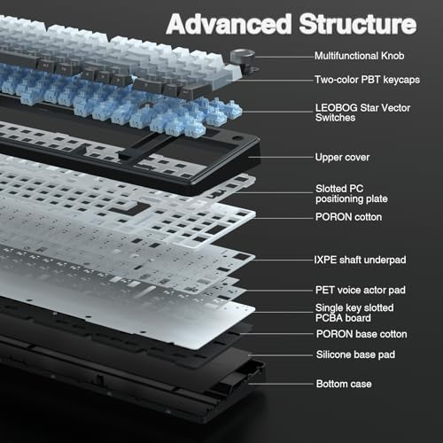 Hot-swappable Custom Keyboard:The switches and keycaps can be freely replaced(keycap/switch puller are included in the package). This customizable keyboard with hot-swap PCB allows users to replace 3 pins/5 pins switches easily without soldering issue. AULA F99 Pro hot swappable mechanical keyboard equipped with LEOBOG Star Vector switches, bring smooth typing feeling and pleasant typing sound, provide fast response for exciting game